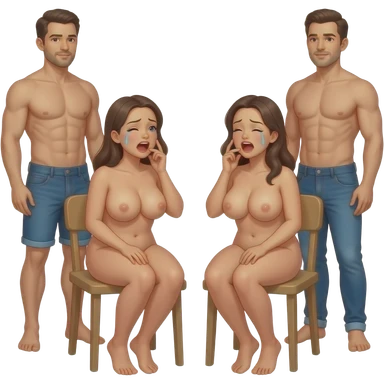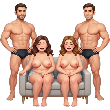 Naked women with massive boobs moaning and sweating sitting with naked men standing emoji