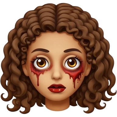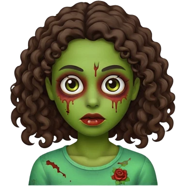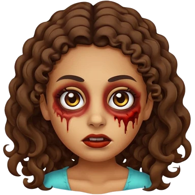 Create a zombie emoji inspired by a young woman with tanned skin, an oval face, large dark eyes, defined eyebrows, a small nose, and medium lips. Her hair should be long, curly, and brown. emoji