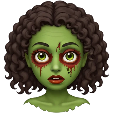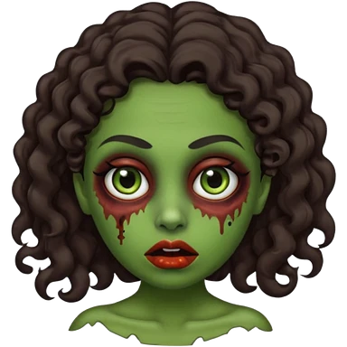 Create a zombie emoji inspired by a young woman with tanned skin, an oval face, large dark eyes, defined eyebrows, a small nose, and medium lips. Her hair should be long, curly, and dark brown. make a green skin like a zumbie original emoji emoji