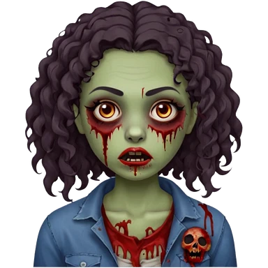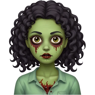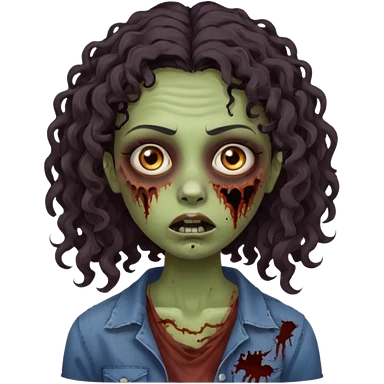 Create a zombie emoji inspired by a young woman with tanned skin, an oval face, large dark eyes, defined eyebrows, a small nose, and medium lips. Her hair should be long, curly, and dark. emoji