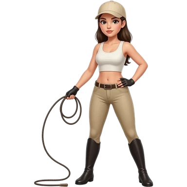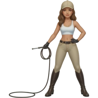 woman in beige riding jodhpurs, white crop top, and beige baseball cap, cracking a bullwhip in one hand, and her other hand on her hip, standing with her legs apart emoji