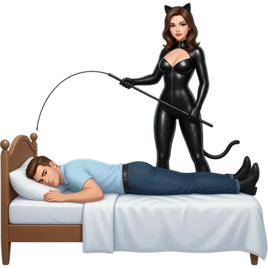 woman in a catsuit with a riding crop standing over a man laying face down on a bed emoji