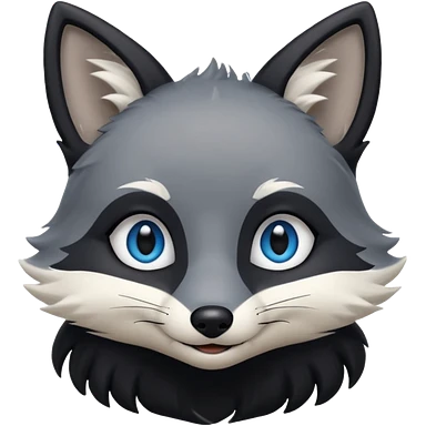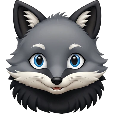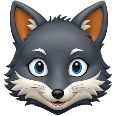Grey furry fox with a black coat, blue eyes, and a small fringe of black hair, smiling emoji