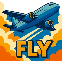 airplane flying through pixelated sky with FLY in blocky letters, pixel art style emoji