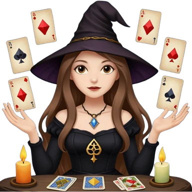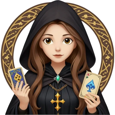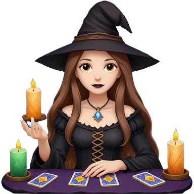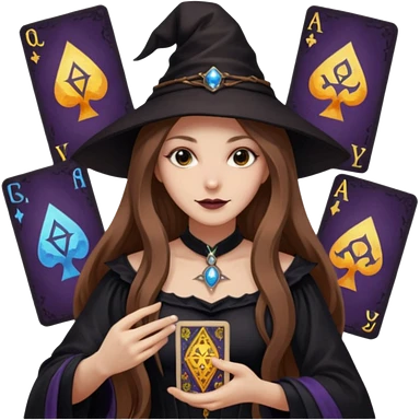 dark witch girl with long light brown hair and Tarot cards emoji