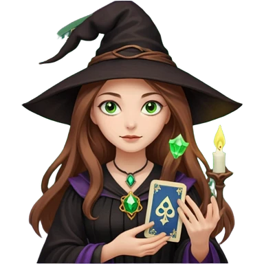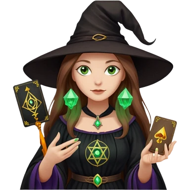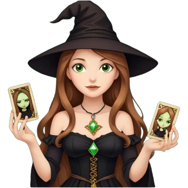 dark witch girl with long light brown hair and green eyes and Tarot cards emoji