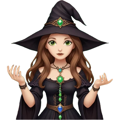 witch girl with long light brown hair and green eyes and Tarot cards without hat and in sexy dress emoji