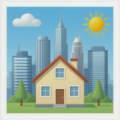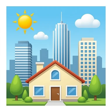 a house and tall office buildings on a simple white background, do not add clouds emoji