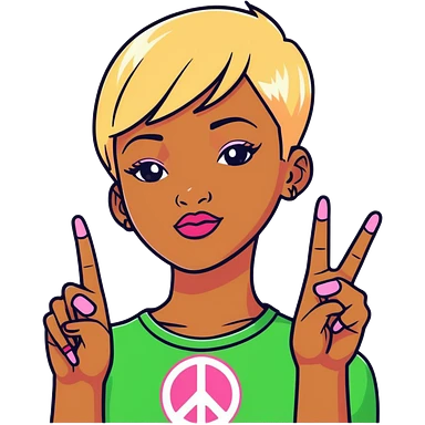 African-American female, with very short blonde pixie hair with bang to the side, wearing pink and green and the two finger peace sign emoji