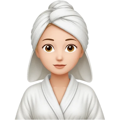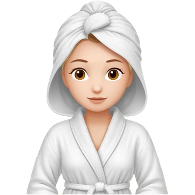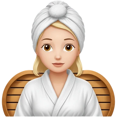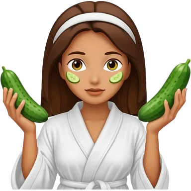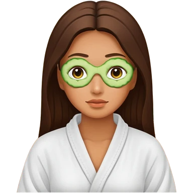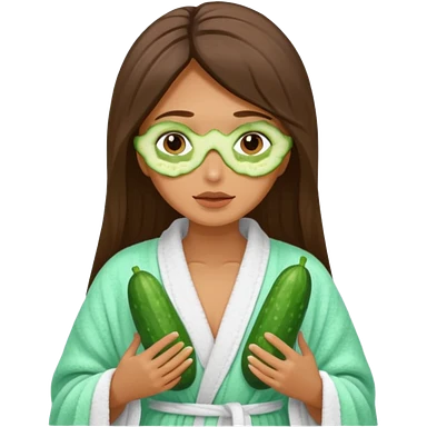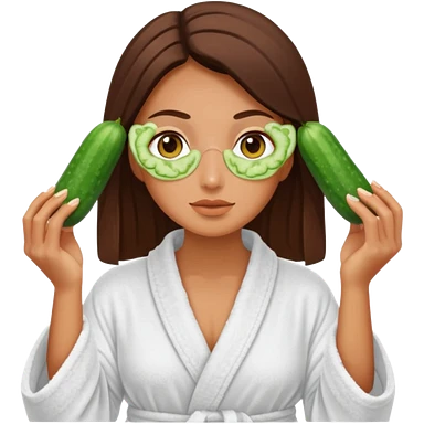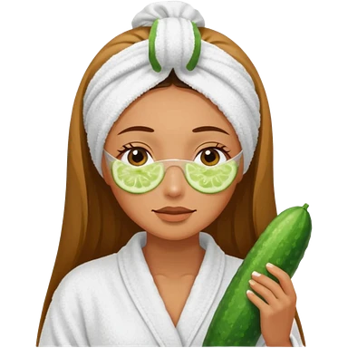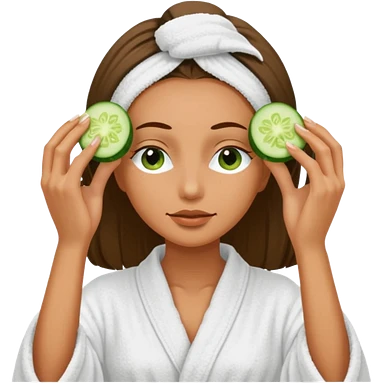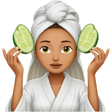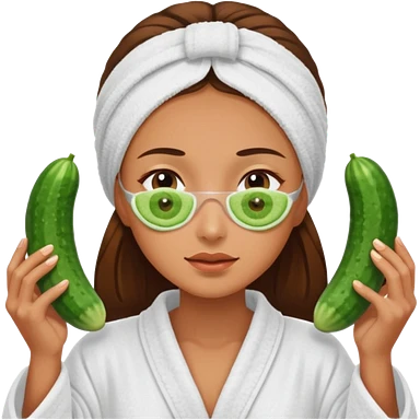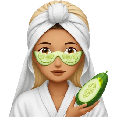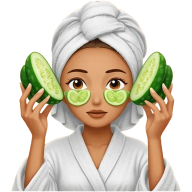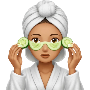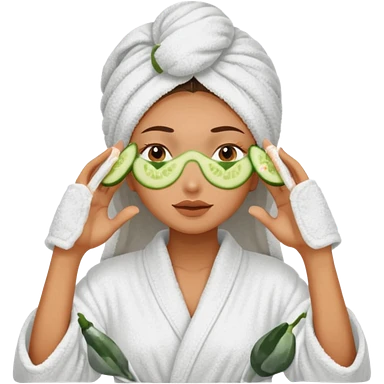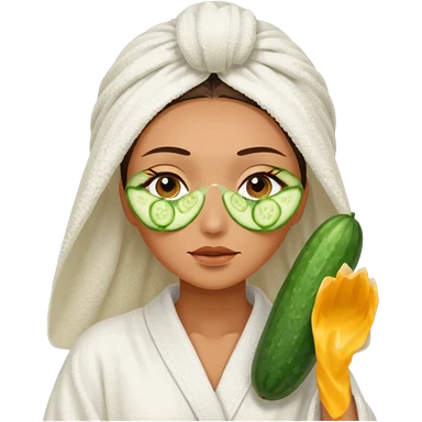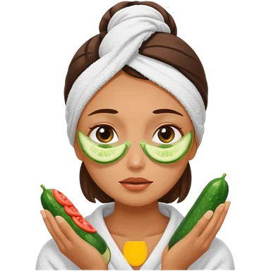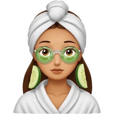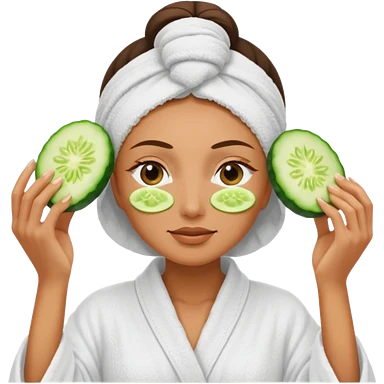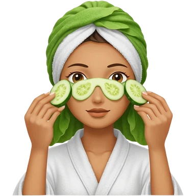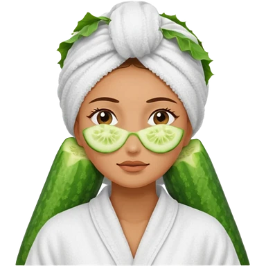 woman at the spa with cucumbers slices covering her eyes and tan skin tone with towel completely covering hair and robe on emoji