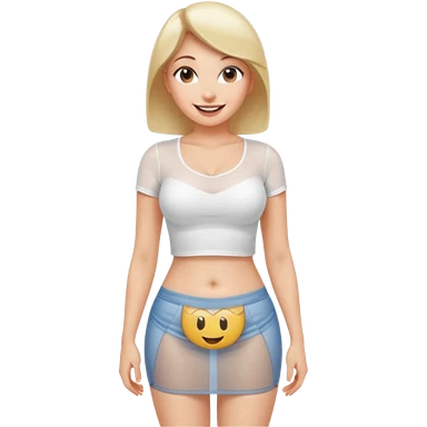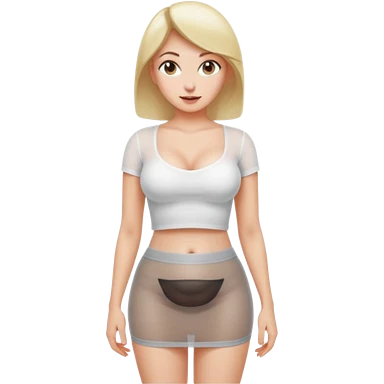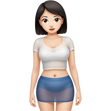 Sexy Mini skirt very short. Her boobs are very large. She is wearing a white half T-shirt that shows her belly button. The shirt is tight and see-thru emoji