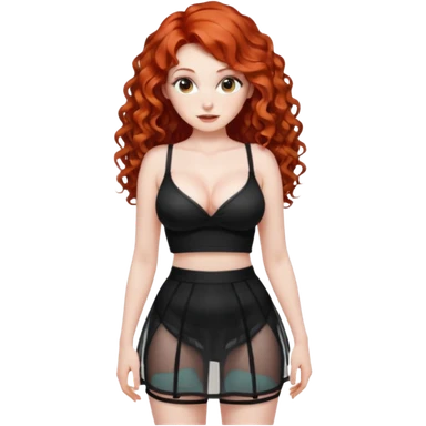 Naked red haired girl with long curly hair and very large big boobs and cleavage. Thin waist and wide sexy hips. She is completely naked and wearing a see-thru black mesh very short mini-skirt emoji