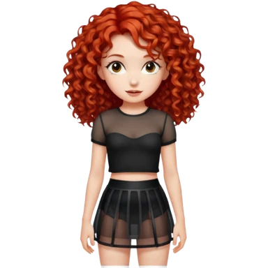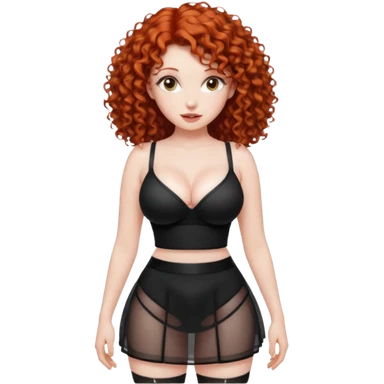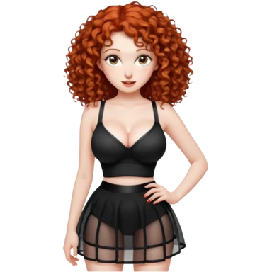 Naked red curly haired girl with very large big boobs and cleavage. Thin waist and wide sexy hips. Completely naked but wearing a see-thru black mesh very short mini-skirt emoji