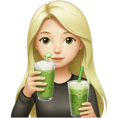 blonde luxury long hair girl with 1 matcha latte and 2 straws emoji