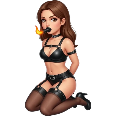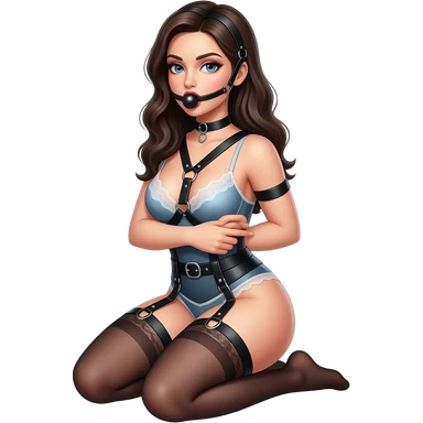 Women in bdsm Dessous. Heat leather Harness with Ballgag in Her mouth. Setting on her knee. Arms behind body. emoji