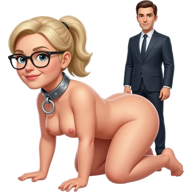 Frau 50 Jahre. brille. blond Pferdeschwanz gebundene Haare. nackt. Metall collar with O-Ring. Vierfüsslerstand. Mann steht hinter Ihr ihm suit emoji