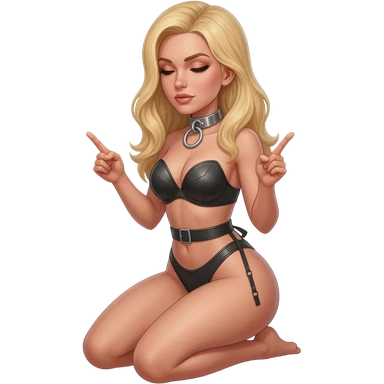 Blonde woman Metal choker Large O-ring Leather lingerie Sits on her knees Hands open and pointing upwards Eyes looking humbly downwards emoji