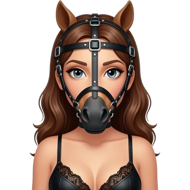 Women in bdsm Dessous. leather pony Harness on her head with Horse Bridle in the mouth emoji