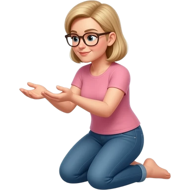 Die Frau 40 Jahre, Brille blondes haar . Sie kniet auf beiden Knien. Ihre Unterschenkel liegen nach hinten auf dem Boden. Der Oberkörper ist aufrecht, Die Arme sind vor dem Körper, die Handflächen zeigen nach oben, als würde sie etwas anbieten, Der Blick ist nach unten gerichtet emoji