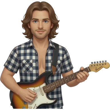 man with long brown hair, electro guitar, completely opened checkered shirt, logo "pearl jam" on shirt emoji