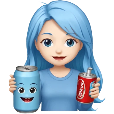 Chibi sticker of a woman with powder blue hair, lower back length, with white eyes hold a can of Monster with a smug smile; cozy cartoon style emoji