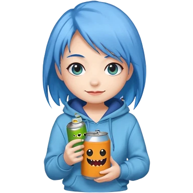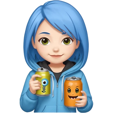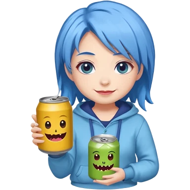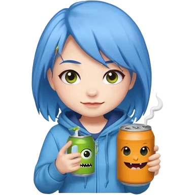 Chibi sticker of a woman with powder blue hair with white eyes hold a can of Monster with a smug smile; cozy style emoji
