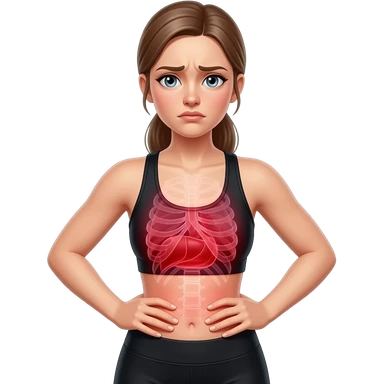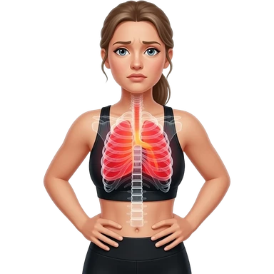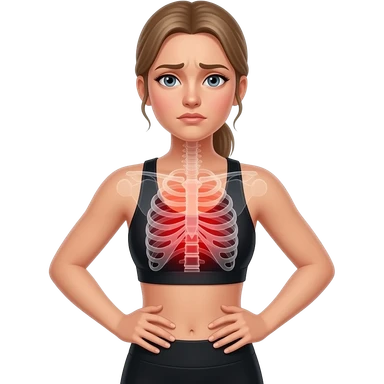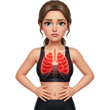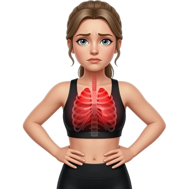 breathing discomfort, full red glow covering chest, ribs, and lung area, woman with hands on ribs, fair-skinned woman, gray-blue eyes, ash brown brows, ash light brown hair tied back, slim athletic body, black workout set emoji