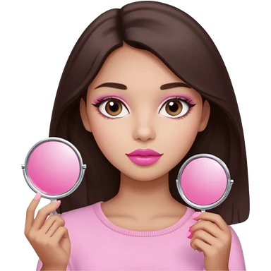 A dark brown hair beautiful eyes medium skin tone of girl carrying a pink mirror to her self and have lip stick on one of her hand look like pink pastel the packaging similar to Rhode lip emoji