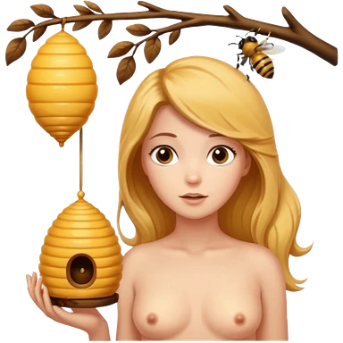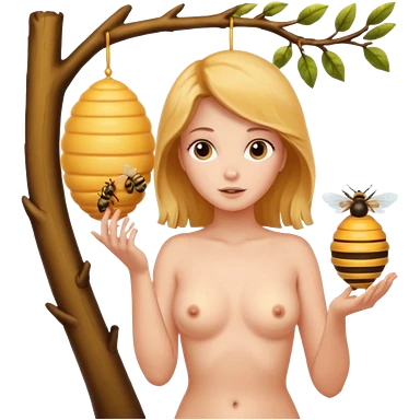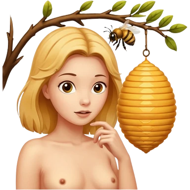 A naked women looking at a beehive hanging by a branch emoji