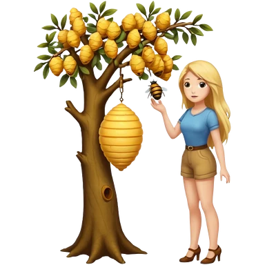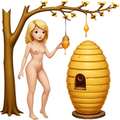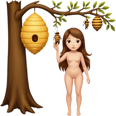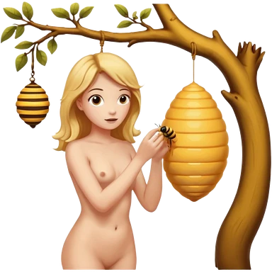 A full body naked women looking at a beehive hanging by a branch from a tree emoji