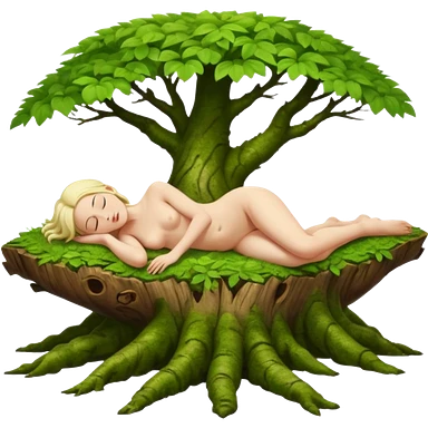 A full body naked women Make this character Lying down on a green mossy tree trunk in a deep rainforest. Connecting the nature with her eyes closed.shinrin yoku forest bathing emoji