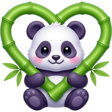A cute purple panda hugging two bright green bamboo stalks that are curved together to form a heart shape. Kawaii aesthetic, soft pink blushing cheeks, bold outlines, vibrant green and deep purple colors, solid background. emoji