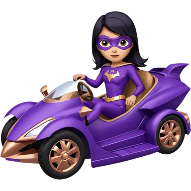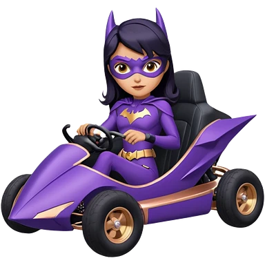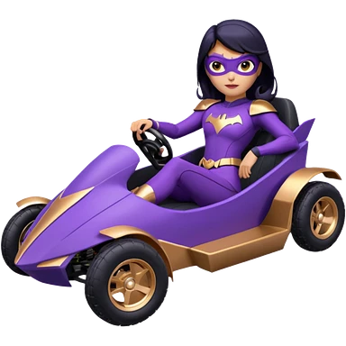 Hot full size real-appearance racing action BatGirl’s Lego feminine midnight-purple tight outfit sixty’s tv show 1992 stealthy retro sporty petite off-road pursuit hovering hover cruiser car rose gold accents (black hair,reclined and relaxed seating position) go kart emoji