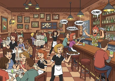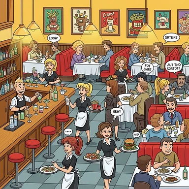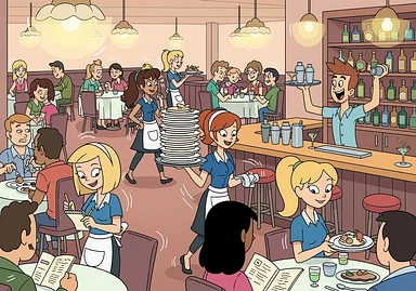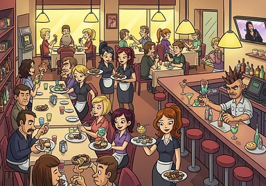 Illustration d'un restaurant avec des clients à table, des serveuses qui prennent les commandes et qui amènent les plats. Un barman sert des cocktails. Ambiance chaleureuse. Style cartoon années 2000. emoji