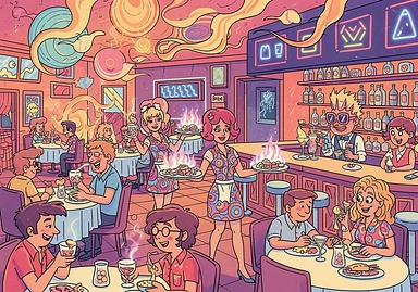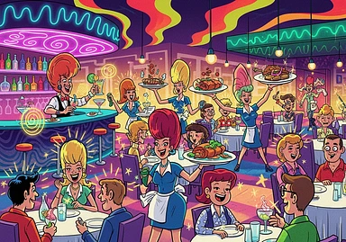 Illustration d'un restaurant avec des clients à table, des serveuses qui prennent les commandes et qui amènent les plats. Un barman sert des cocktails. Ambiance chaleureuse, clients ravis. Cartoon années 80, couleurs et effets psychédéliques. emoji