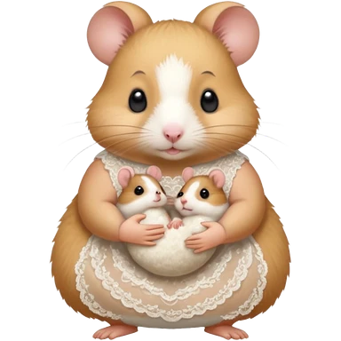 Mama hamster wearing white lace sexy dress holding baby hamster emoji