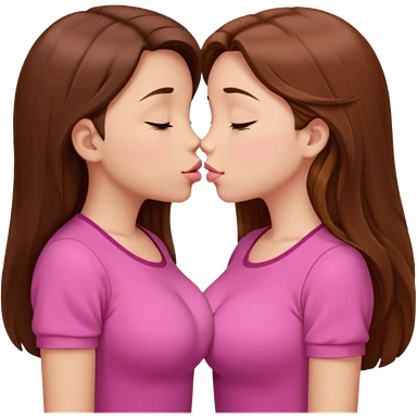 two 5 year old gals about to kiss on the lips, lips extremely close but not touching, pink shirts, long brown hair, big boobs emoji