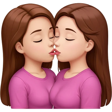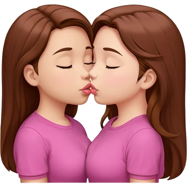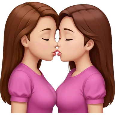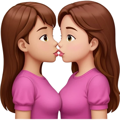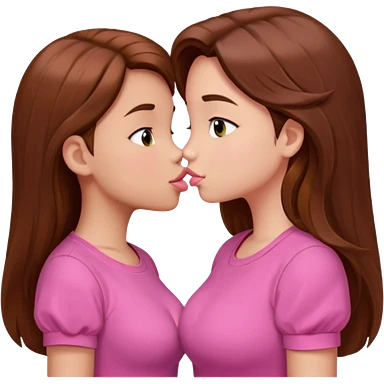 two 5 year old gals about to kiss on the lips, lips extremely close but not touching, pink shirts, long brown hair emoji