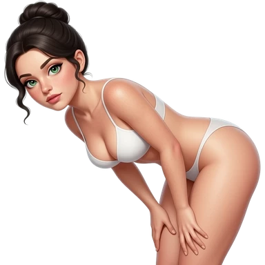 Full body frontal nude very beautiful white young woman very beautiful face with freckles, green almond eyes long lashes, wavy black hair in a bun i big boobs, big ass, sexy body, bending over, getting ready for sex, realistic, big ass, busty but skinny. Nude. emoji