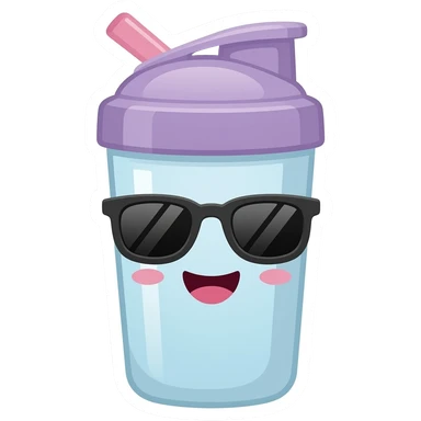 "A cute sticker of a happy protein shaker bottle wearing sunglasses, aesthetic pastel colors, minimal vector style, white border." emoji