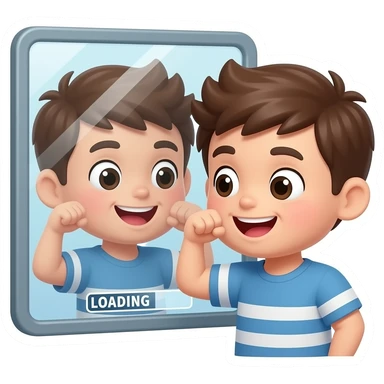 A cute sticker of a boy looking in the mirror checking tiny biceps, 'LOADING' bar text, funny expression, white border. emoji