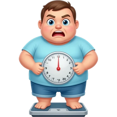 A cute sticker of a chubby character standing on a scale, their belly covering the numbers, funny dramatic face, white border, vector. emoji