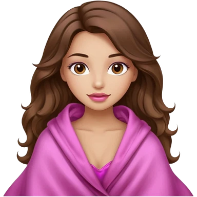 girl with long wavy brown hair, brown eyes, long lashes makeup, sexy pink lips, light to medium complexion, wearing a pink sexy silk top, big blanket over the head cozy holding a cat emoji