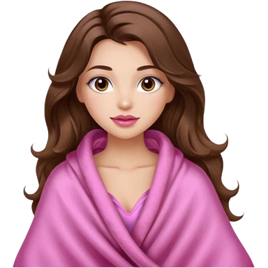 girl with long wavy brown hair, brown eyes, long lashes makeup, sexy pink lips, light to medium complexion, wearing a pink sexy silk top, big blanket over the head cozy emoji