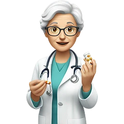 A Caucasian female doctor with glasses serving 25 pills to an old woman emoji