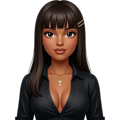 De pele parda,cabelo longo e lisos franja vegana divida e o outro lado prendida com um broche,gargantilha e um colar de cruz,uma blusa preta e sexy e seios grandes emoji