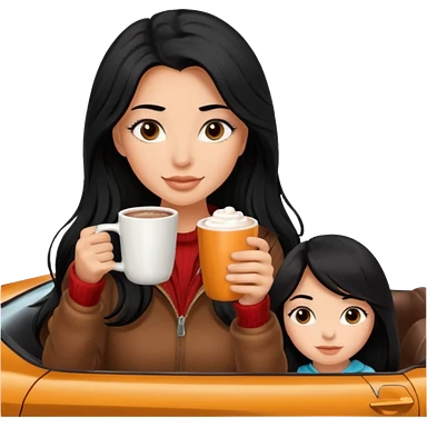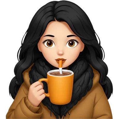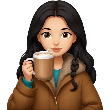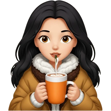 anned Girl with lashes , bright black long hair, in an extremely big fluffy oversized jacket, and drinking hot chocolate drink emoji