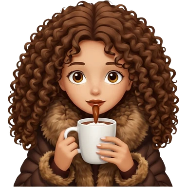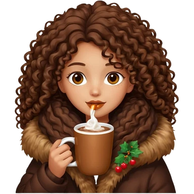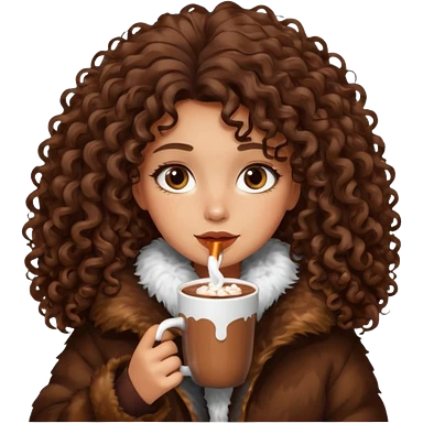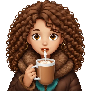 tanned girl with long brown curly hair, drinking hot chocolate , wearing oversized fur jacket emoji