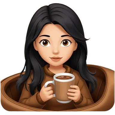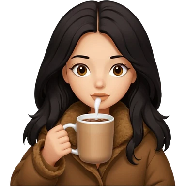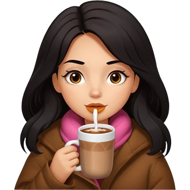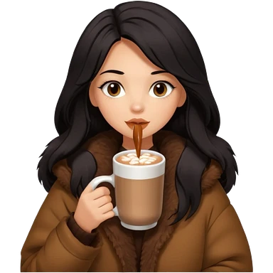 anned Girl with lashes , bright black long hair, in an extremely big fluffy brown oversized jacket, and drinking hot chocolate drink emoji