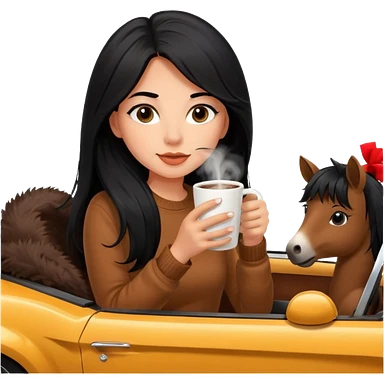 anned Girl with lashes , bright black long hair, in an extremely big fluffy brown mustang, and drinking hot chocolate drink emoji
